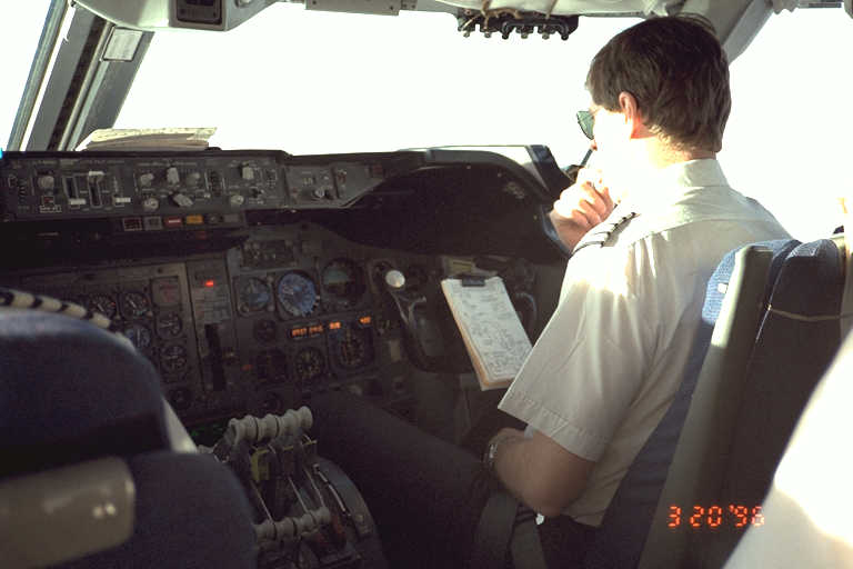 The Flight Engineer leans forward to assist